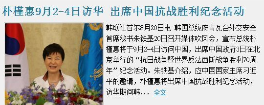 据韩联社8月20日报道,韩国总统府青瓦台外交安全首席秘书朱铁基20日召开媒体吹风会,宣布总统朴槿惠将于9月2-4日访问中国,出席中国政府3日在北京举行的“抗日战争暨世界反法西斯战争胜利70周年”纪念活动。