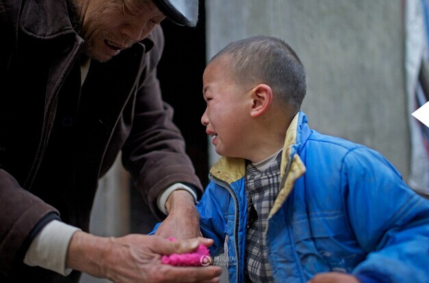 吃饭前,爷爷给坤坤洗手,因为手上冻裂,沾水特别疼,罗坤哭着喊疼。他一个月大时,父亲离家,十个月大时,母亲离家,爷爷奶奶把他拉扯大,爷爷奶奶是他最亲的人。